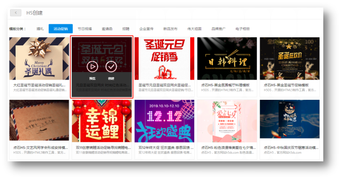 2.您可以在这里根据模板选择预览或创建,当鼠标悬浮在模板上则会出现预览和创建按钮。
