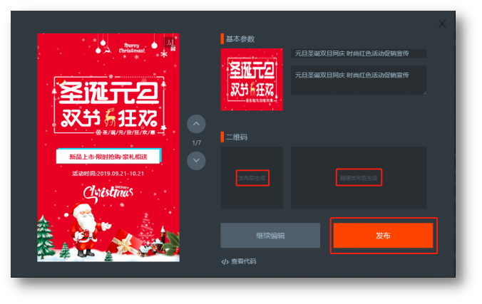 5.点击“预览/发布”,会看到你更改后的H5,会有提示说明没有发布则不会生成二维码和链接。点击发布按钮,这会生成一个可以预览的二维码和链接。